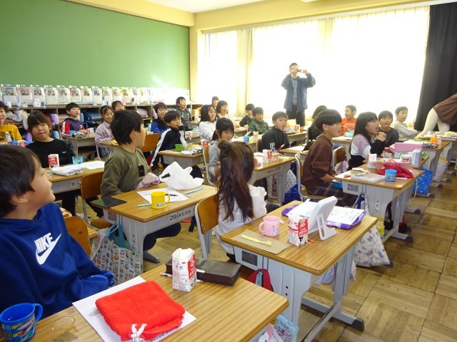 歯を守るためにはだ液が必要であり、唾液をしっかり出すためにはよく噛むことが大切だと教えていただきました。そして、唾液が出やすくなる「あいうべ体操」や大きな歯の模型でお手本を示しながら正しい歯の磨き方も教えていただきました。