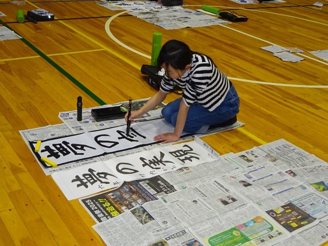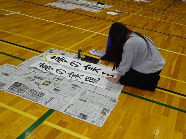 そして、緊張感に満ちた体育館で学年一斉に真っ白な条幅に向かい、お題の「夢の実現」に挑戦しました。