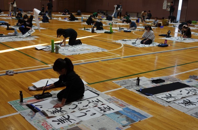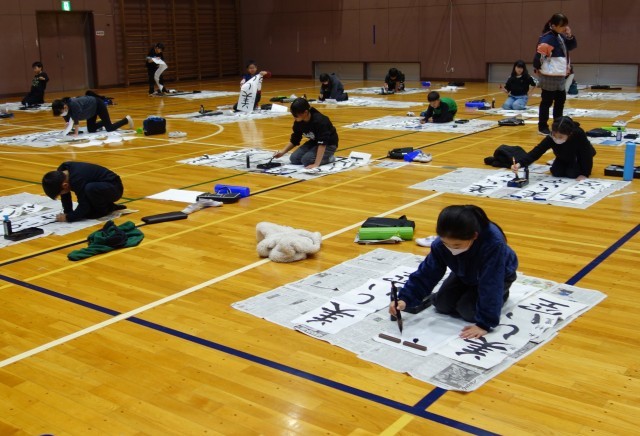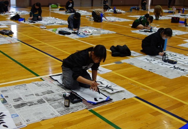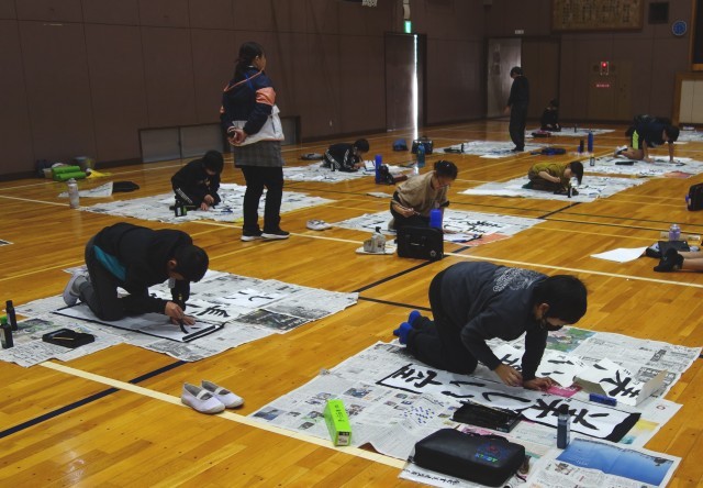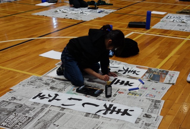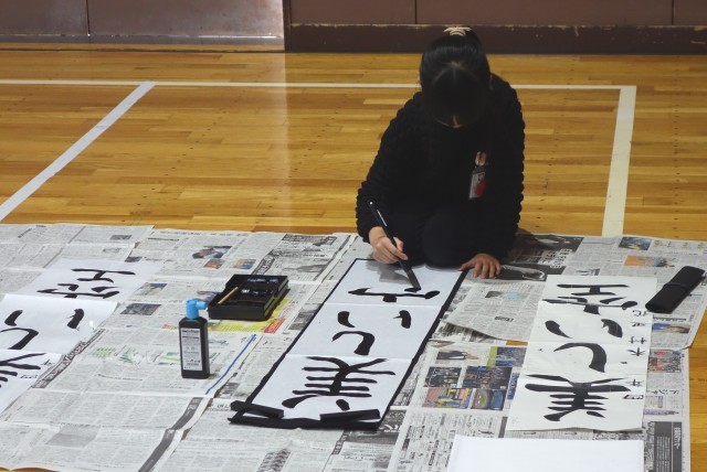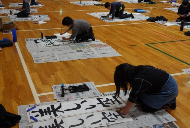 3年生以上は体育館で条幅に指定の言葉を書きます。