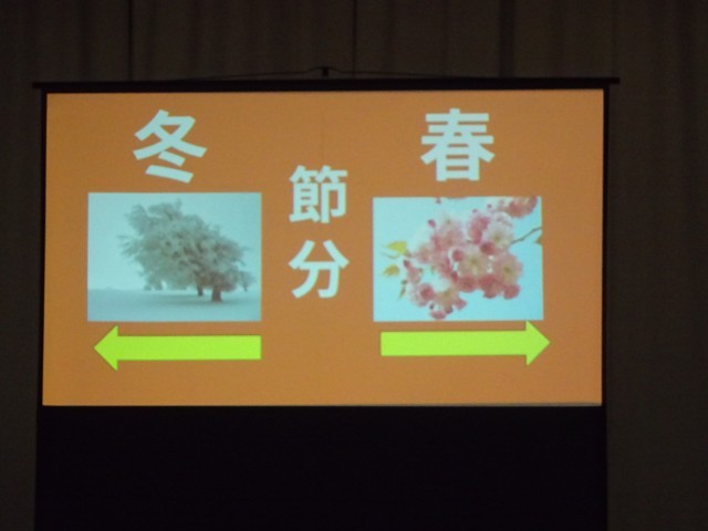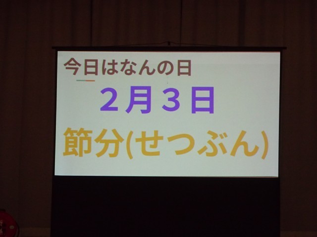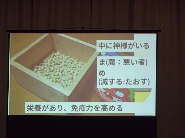 スライドで、節分とは冬と春を分ける日であること、古来より中に神様がいると信じられてきた豆をまくことで鬼や病気を追い払ってきたこと、さらには福を呼び込もうとしてきたことなどを学びました。