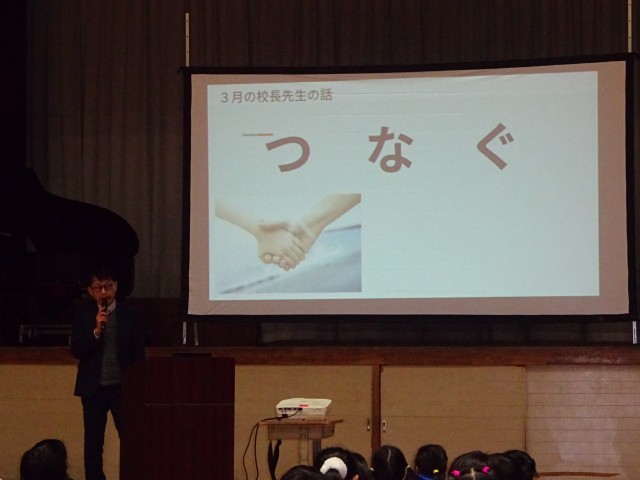 今朝の全校朝会は「つなぐ」ということについて、校長先生より講話をいただきました。