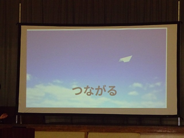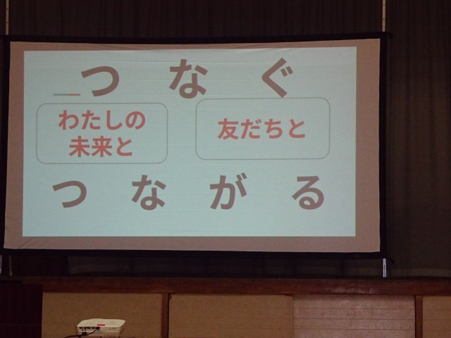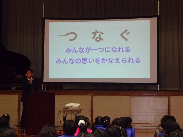 スライドを使って、手をつなぐ、線をつなぐ、新幹線で遠隔地をつなぐなどの様々な“つなぐ”があることを確認し、つなぐことでみんなが一つになれたり、思いが叶えられることを教えていただきました。