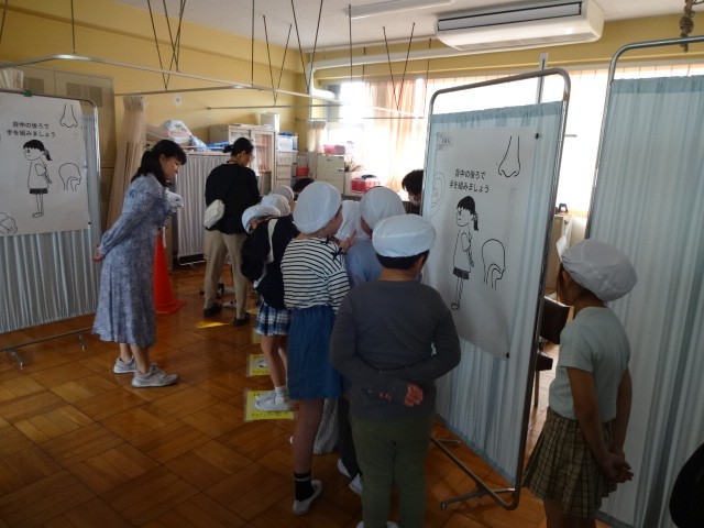 校医さんによる検診が始まりました。本日は、1,3,5年生の耳鼻科検診を行いました。子供たちは、お医者さんの前で少し緊張している様子も見られましたが、順番を守りながら静かに検診を受けることができました。