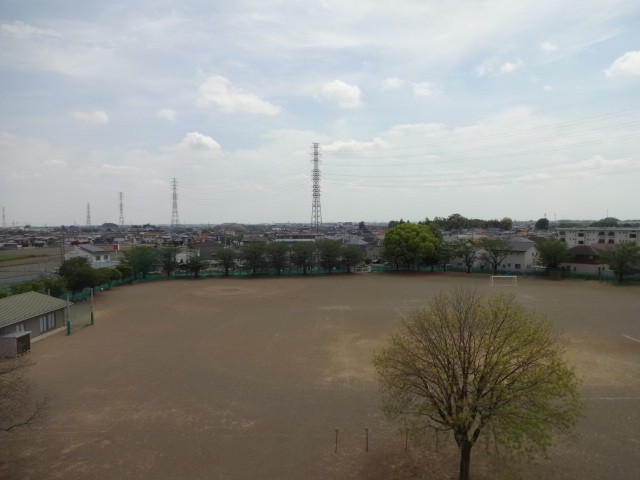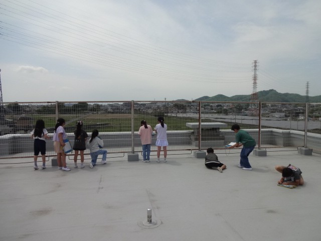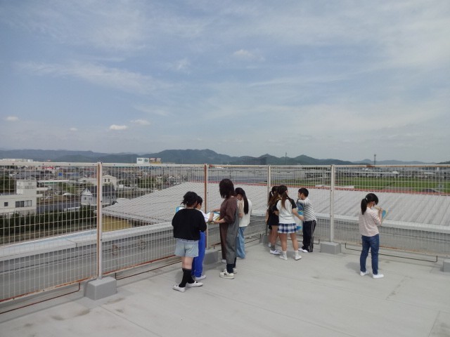 3年生が社会の学習で、屋上から学校のまわりの様子を観察しました。東西南北のそれぞれに見える建物や土地の様子を真剣に見ていました。