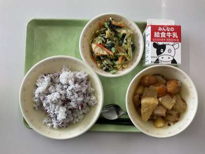 今日の献立は、 ゆかりごはん 牛乳 かんとう煮 ごま和え です。