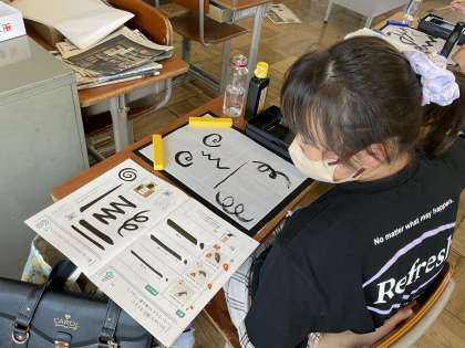 道具の並べ方、筆の持ち方、書き方について学びました。