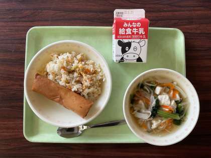 今日の献立は、 中華混ぜごはん 牛乳 はるまき 中華スープ です。