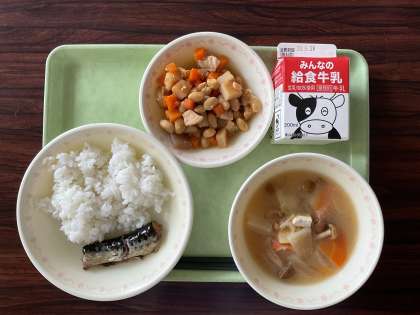 今日の献立は、 ごはん 牛乳 いわしの梅煮 ごもく豆 なめこ汁 です。