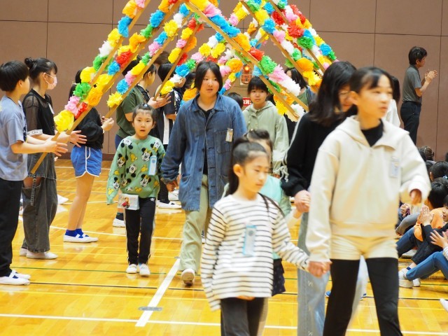 両サイドで2年生から5年生が拍手で迎えました。
