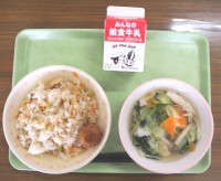 本日のこんだては鶏ゴボウごはん、牛乳、厚焼きたまご、あったか豚汁です。