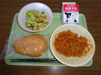 本日のこんだてはコッペパン、牛乳、コーンサラダ、ナポリタンスパゲッティです。