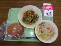 今日の献立は、バンズパン、牛乳、ひじきとツナの彩り和え、ちゃんぽんうどんです。ち...