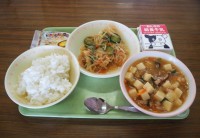 本日のこんだてはごはん、牛乳、韓国風焼き肉、水ギョウザスープです。