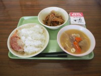 本日の献立は、ごはん、豚肉の南部焼き、野菜たっぷりみそ汁、牛乳、カレーパリッシュ...
