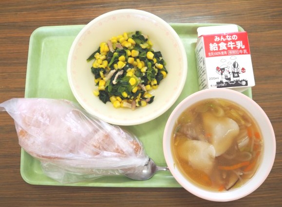 本日のこんだてはいちご揚げパン、牛乳、三色ソテー、水ギョウザスープです。揚げパン...