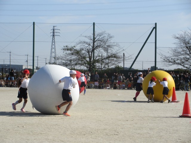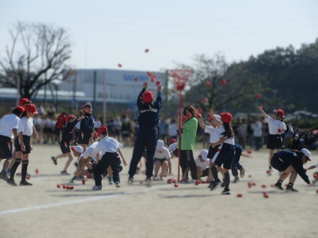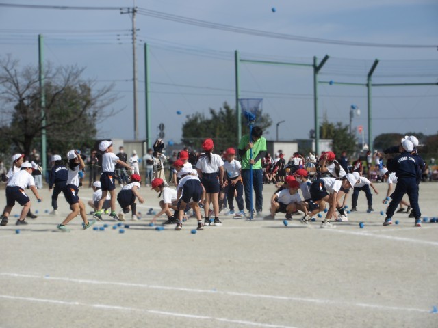低学年は自分の体より大きな玉を協力しながら運び、運んだ後の姿勢もピシッとしていました。 中学年は簡単だと思われがちな玉入れですが、離れた所から投げると難しそう。入れた数の発表ではドキドキでした。