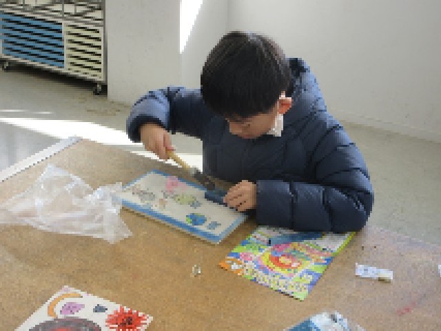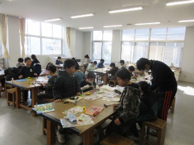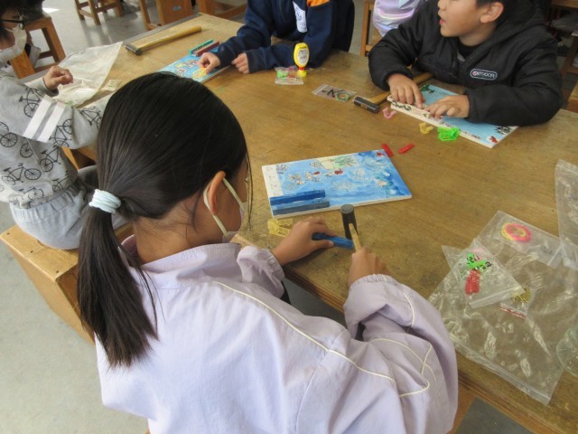 トントン どんどん くぎうって 公開日 2025/12/05 更新日 2025/12/05 お知らせ 図工室からトントントン・・・と音が聞こえて行ってみると、3年生が図工の学習で、金づちを使って釘を打っていました。ビー玉を使った楽しいおもちゃを作っています。初めて金づちを使う子もいましたが、先生や友達に教わりながら真剣に釘を打っていました。何事も経験ですね!