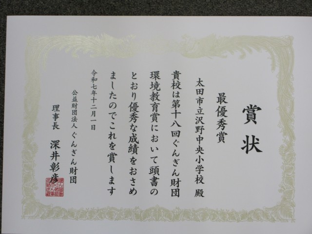 馬県教育委員会後援のぐんぎん財団環境教育賞において、沢野中央小学校が最優秀賞を受賞しました。沢中小に関わる皆で取り組んでいる教室でのエコ活動、環境美化委員会のエコ活動、家庭の協力によるエコ活動を紹介したところ、評価されました。身近なエコ活動が地球の環境保全につながっていることを忘れずに、これからも取り組んでいきたいと思います。