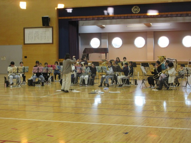 放課後の体育館から楽器の音が聞こえてきました。金管バンドの子供たちが先生と一緒に真剣に