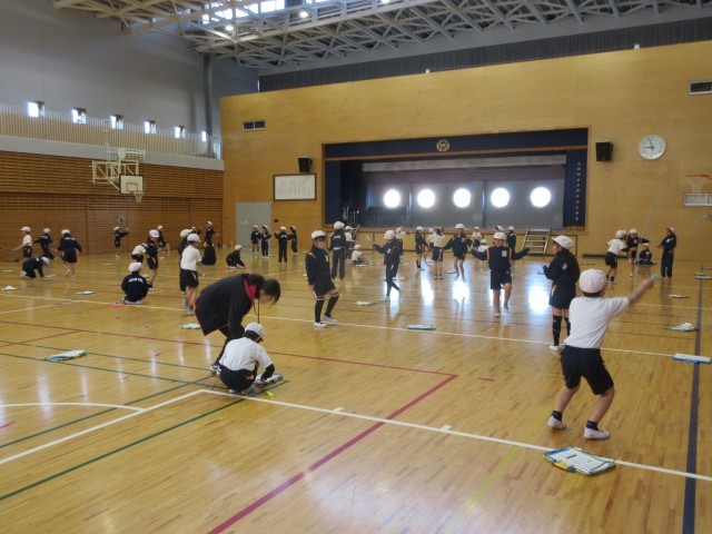 短縄跳びも頑張っているよ 公開日 2026/01/23 更新日 2026/01/23 お知らせ 体育の時間には、どの学年も長縄跳びだけでなく短縄跳びにも挑戦しています。今日は2年生が体育館で、跳ぶ回数やできる技を増やそうと頑張っていました。床に置いてあるのは「なわとびカード」で、跳べると嬉しそうに記録していました。