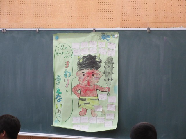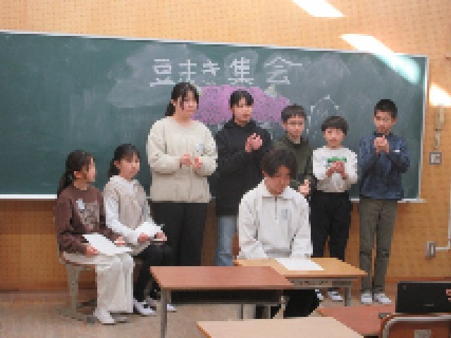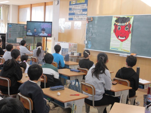 児童会本部の子供たちが企画した第4回えがお集会は豆まき集会でした。オンラインで行い、児童会長さんから節分の意味を教えてもらった後、各クラスの代表が各クラスの追い出したい鬼を発表しました。各クラスでは追い出したい鬼の絵と、一人一人が自分の中から追い出したい鬼を紙に書いて準備がしてあり、最後に全員が追い出したい鬼を書いた紙を丸めた紙豆を鬼にぶつけて追い出しました。自分の力だけでは追い出せない弱点を追い出せたかな?前日に節分給食が出ました。