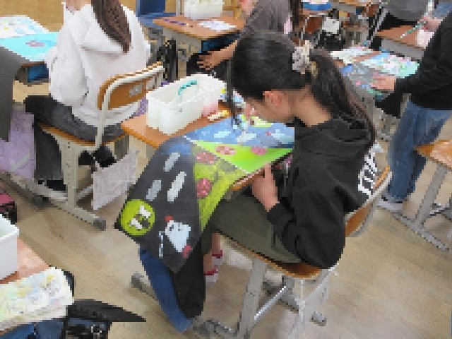 木版画~多色刷り~ 公開日 2026/03/11 更新日 2026/03/11 お知らせ 5年生の木版画は多色刷りです。彫った板に着色したい色の絵の具を塗り、黒い紙を上から置いてこすります。それを繰り返して、1枚の版画絵に仕上げます。色が入るとすてきですね。