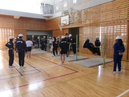 2月27日(火) 体育館では、6年生の体育がおこなわれていました。今回は、夏の職員研修でおこなった鉄棒運動を、実際に児童の皆さんに実践してもらいました。補助具をつけて、今までにできなかった技などに挑戦していました。中には、グライダーなどの大技をおこなっている児童もいましたが、あまりに素早い動きで、うまく画像におさめることができませんでした…。