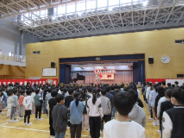 新しいクラスで体育館に集合しました。新任式では、新しく着任された先生方に興味津々...