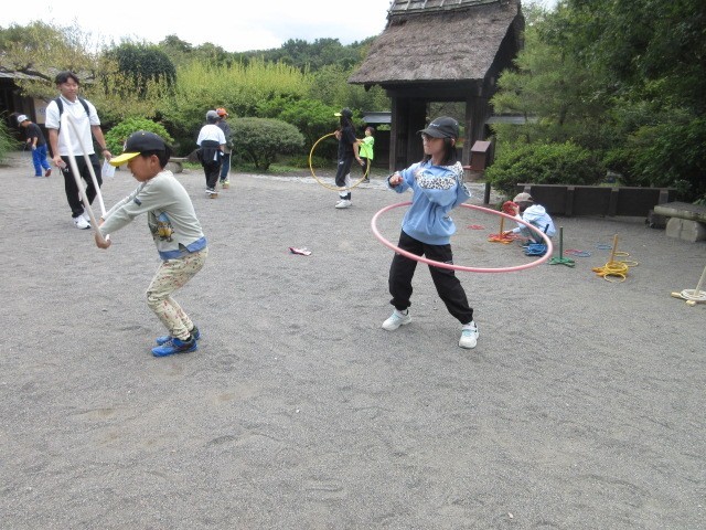 「昔遊び」では、めんこ・コマ回し・おはじき・フラフープ・縄跳び・缶ぽっくりなどなどをして