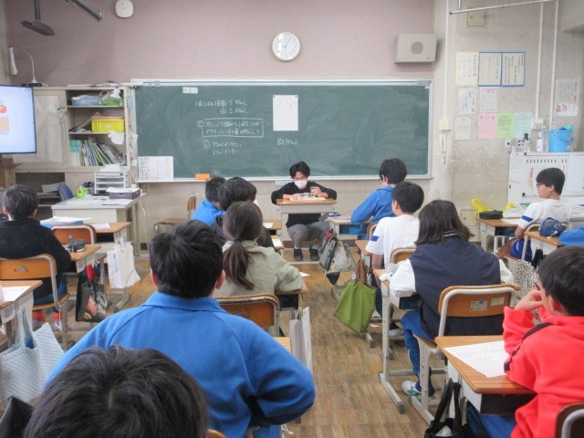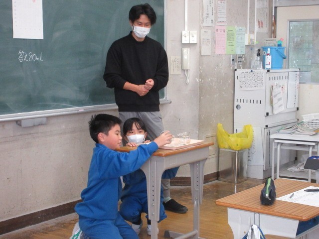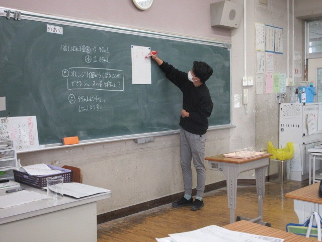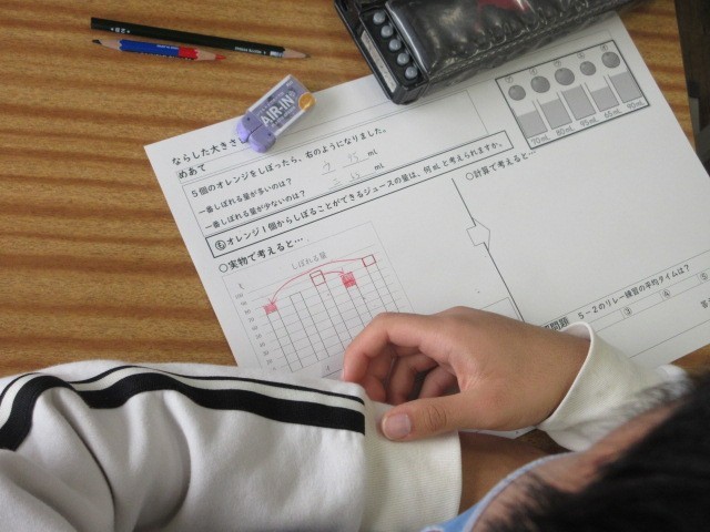 異なる量の水が入った5つのビーカーの水の平均を求める学習です。