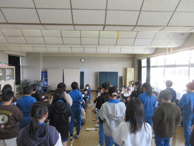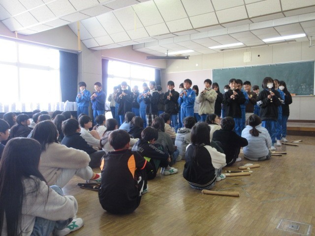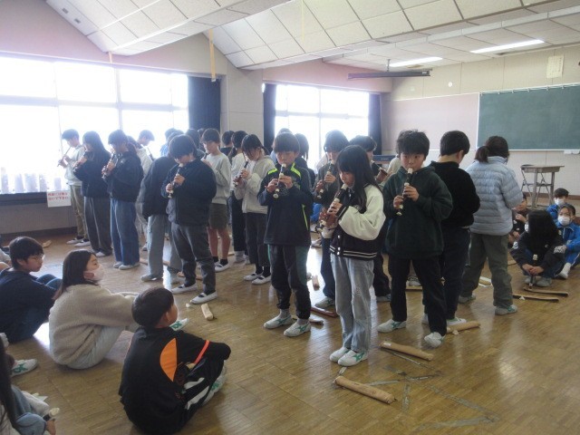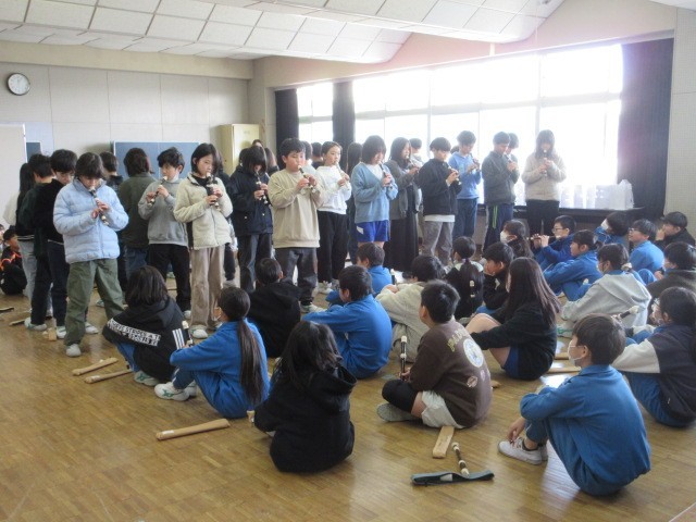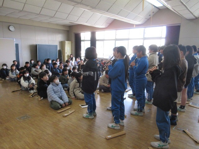 5年生は1クラスずつリコーダー発表をし、お互いに聞き合っています。