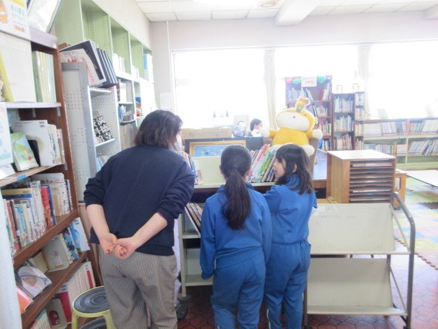 1年生のよいこたちは、図書室の先生におすすめの本を教えてもらっていました。