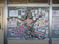 給食の様子をそっとのぞいてみると、みんな静かにもくもくと食べています。ずいぶん食べっぷりがいいなと思ってみていたら、今日の献立は、大好きなそぼろごはん、どさんこ汁、カラフルサラダでした。「背中をぴっと伸ばして、お茶碗を持って食べると背が大きくなるよ。」と話したら、うなずいていました。