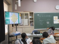 5時間目、1組は校舎周辺を散策しています。児童玄関の前にある尾島かるたの看板を眺め、武田先生のお話を聞くうちに、校歌斉唱となってしまいました。上手に歌っているのを見て、入学して一月、もう校歌をしっかり覚えていることに感心しました。