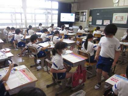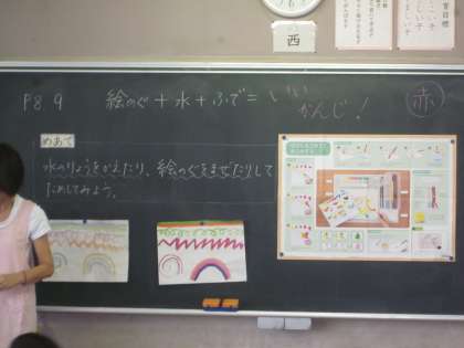 3年生は水彩絵の具を使った学習が始まりました。今まではくれよんや色鉛筆を使っていました。水彩絵の具も水や絵の具の量を変えると色合いが違います。また筆を使うと感じが変わります。材料を変え、方法を考えると違う表現ができることを知ることの入り口ですね。授業では、色々なことを体験できるようにして児童の気づきを引き出します。