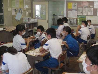 英語の先生の手本を見たり、聴いたりして、隣の友達に語り掛けます。見ていると本当に英語のようになってくるので不思議です。発音がよくなっているということですね。