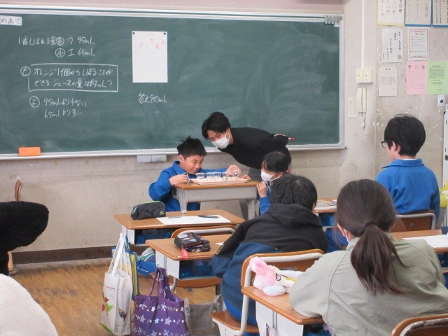 5年2組の算数の授業の様子です。異なる量の水が入った5つのビーカーの水の平均を求...