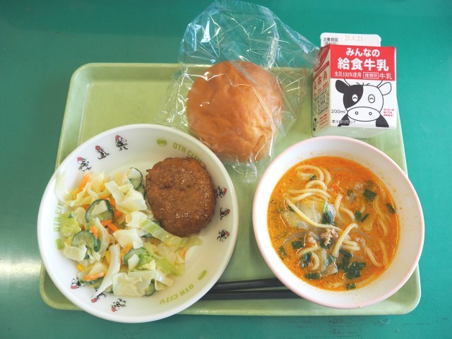 本日のこんだてはまるパン、牛乳、チキンハンバーグ、コーンサラダ、みそラーメンです...
