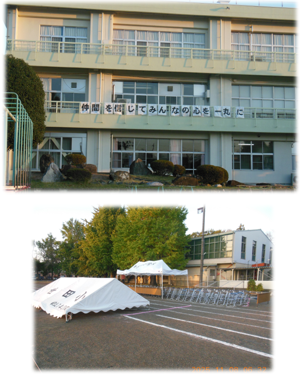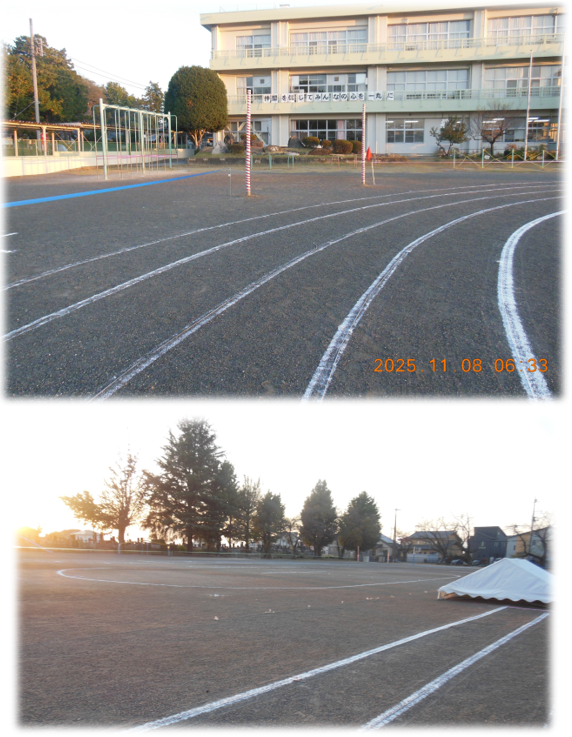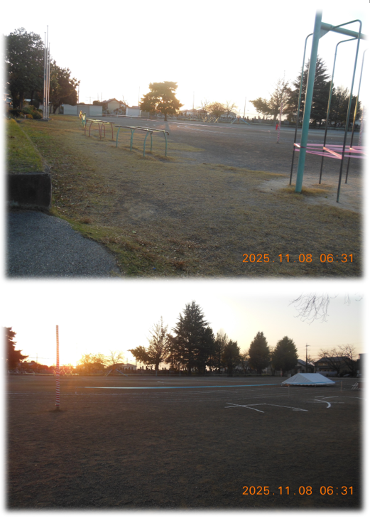 今朝の朝陽に照らされた校庭や校舎が始まりを待っています