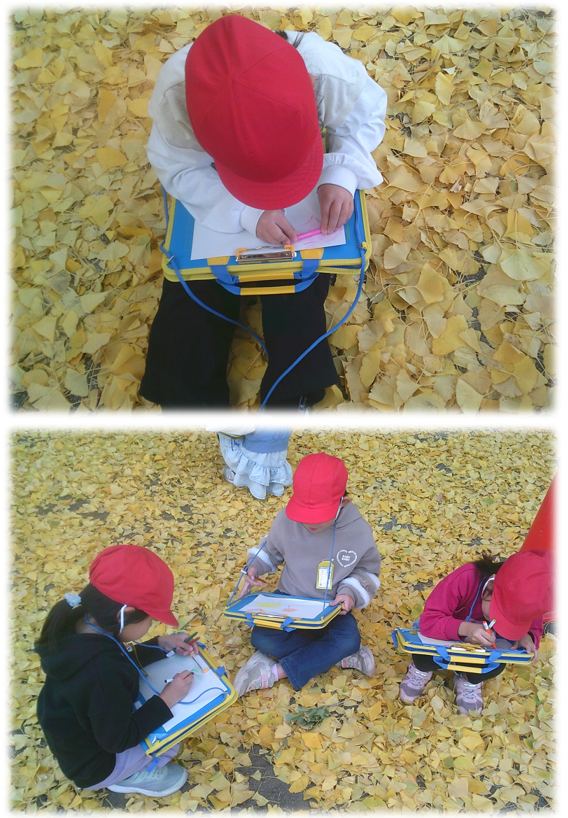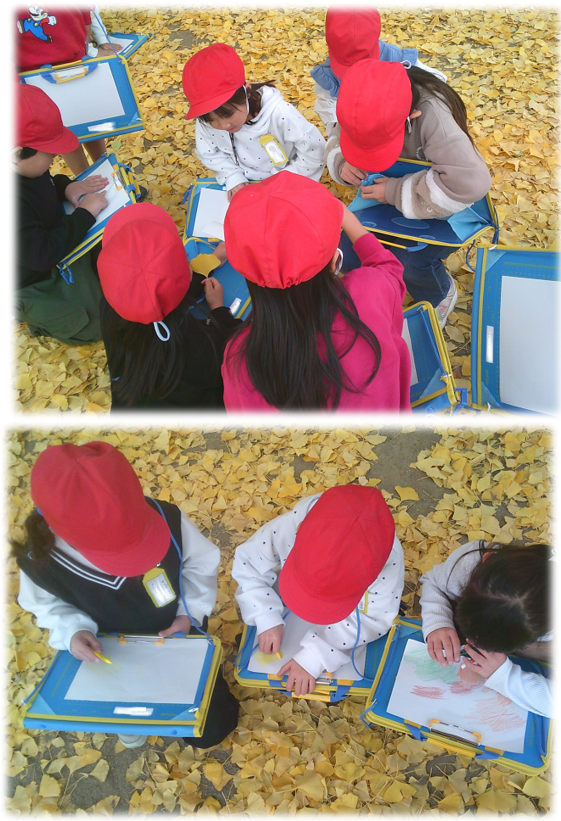 黄色い絨毯のような銀杏の葉 と 1年生の赤帽子の2色がとてもきれいです