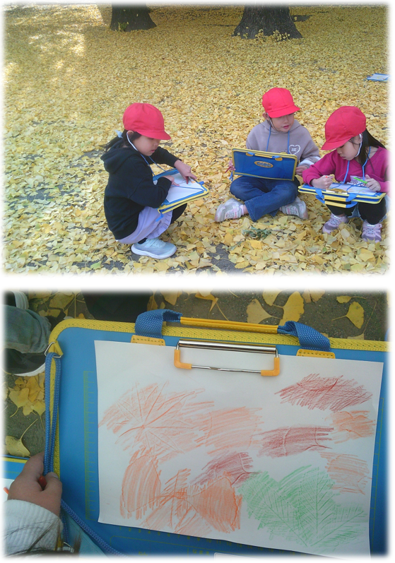 まず葉っぱを写し取って 好きな色で模様を作りました