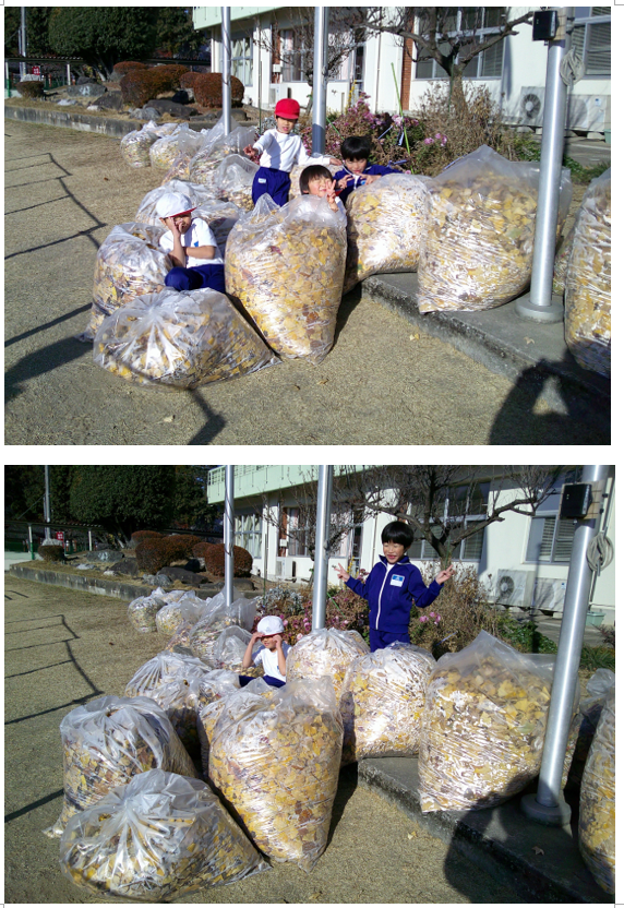 全校児童 全員で 大量の落ち葉を拾いました