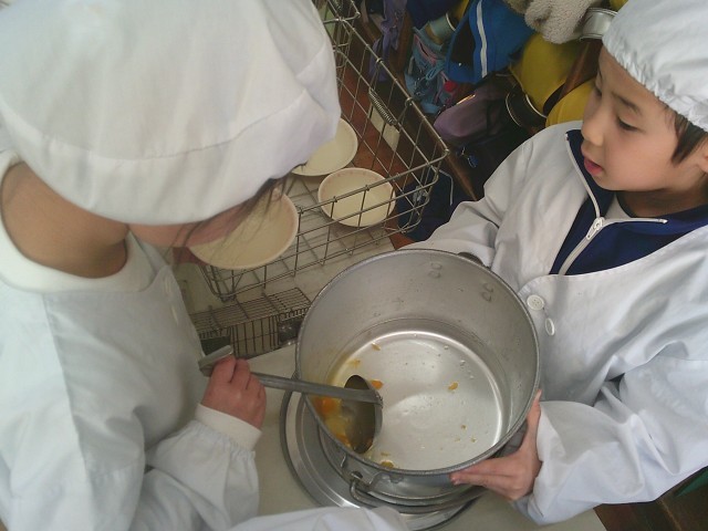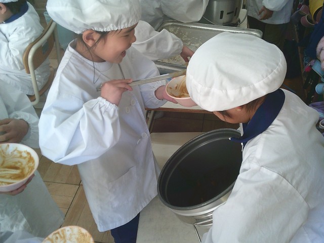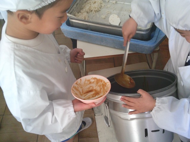 おかわりでは「ご飯食べる人ー?」「はーい!」と仲良くよそっています。