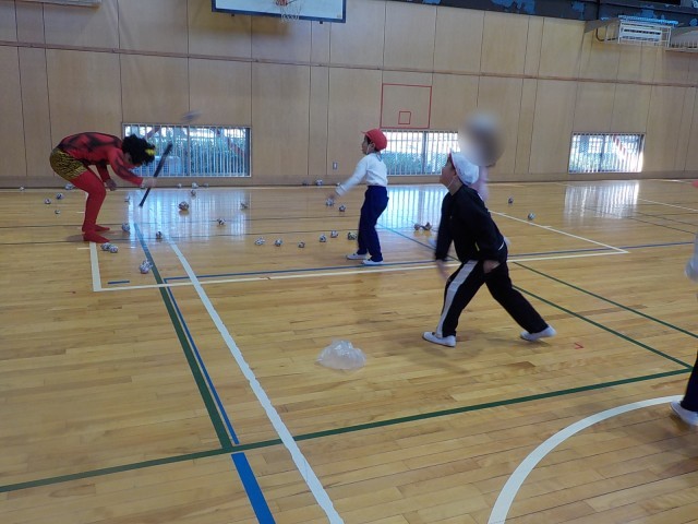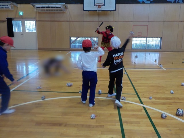 「1年間、健康に過ごせるように」という意味を伝え、豆まきで鬼退治をしました。
