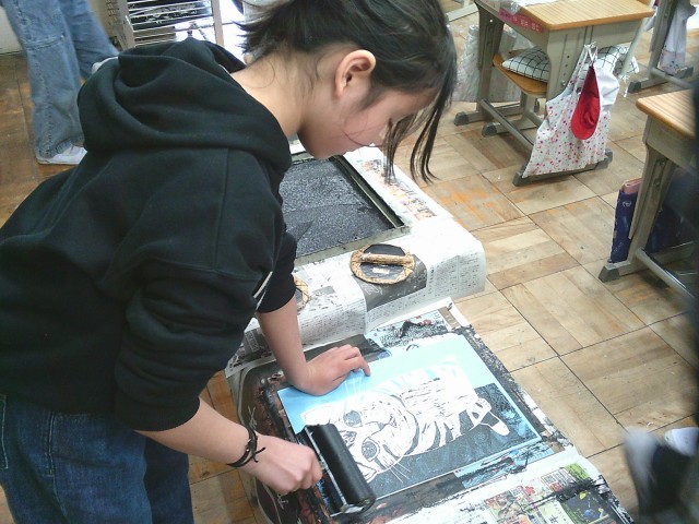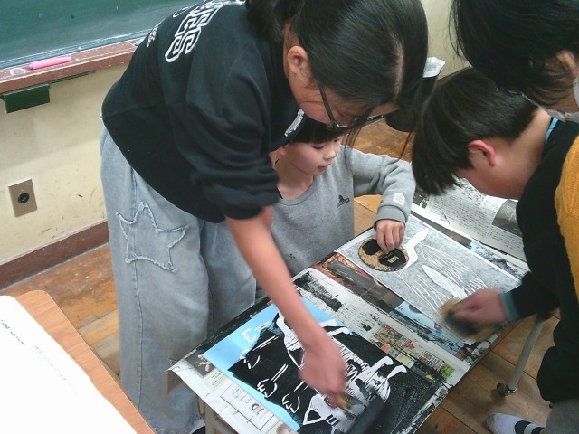 先日の授業参観の時に、保護者の方にご覧いただいた版木にインキをつけ、版画刷りを行いました。児童は二人ペアになり手際よく、版画刷りを行い見事な作品がたくさんできました!