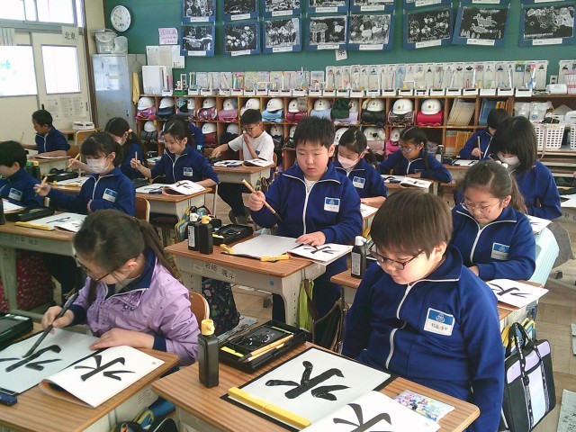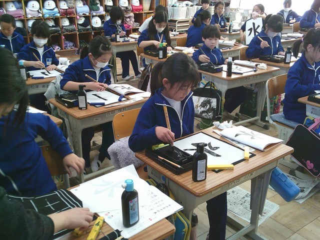 3年生~3年生最後の習字~ 公開日 2026/03/05 更新日 2026/03/05 3年 最後の習字は「水」。自分で気をつけるポイントを考えて、書きました。1年でとても上手になりました。 3年生 国語