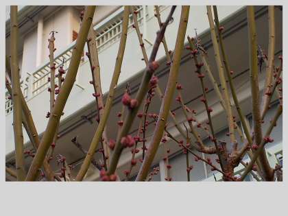 先週から寒さの厳しい日が続いています。校庭の木は葉が落ちて枝だけになっています。花壇の草花は地面に這うように咲いています。しかし、よく見ると枝の先に赤い蕾がついています。今日は節分、明日からは立春です。