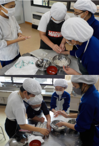 調理実習で白玉だんごを作りました。自分たちで道具を用意し、材料を計量し、使ったも...