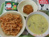 明日は 2学期終業式です22日(月)は 2学期最後の給食です楽しみにしていたクリスマス献立の日ですケチャップライス ぎゅうにゅうフライドチキン コーンクリームスープクリスマスロールケーキとってもお...