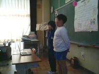 外国語活動で、クイズを出し合いました。色や大きさ・種類などから3つのヒントを作り、出題しました。That's right.などの表現も学習しました。